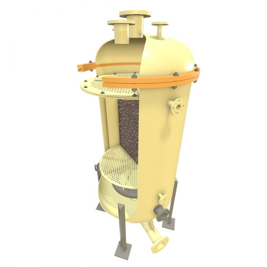 Загрязненная паро-газовая смесь подается сверху установки через входной патрубок и распределительное устройство, обеспечивая равномерное распределение потока по сечению колонны.