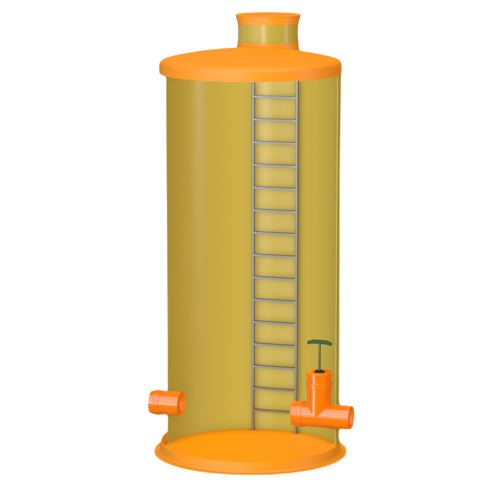 Контрольный колодец представляет собой герметичную емкость диаметром 2.3 м и высотой 5 м, оснащенную люком и крышкой. Цилиндрический корпус поворотного колодца подходит для установки даже в сложных грунтах, например, с плывуном, и не боится внешних нагрузок. А небольшой вес корпуса из стеклопластика, всего 816 кг, облегчает монтаж.