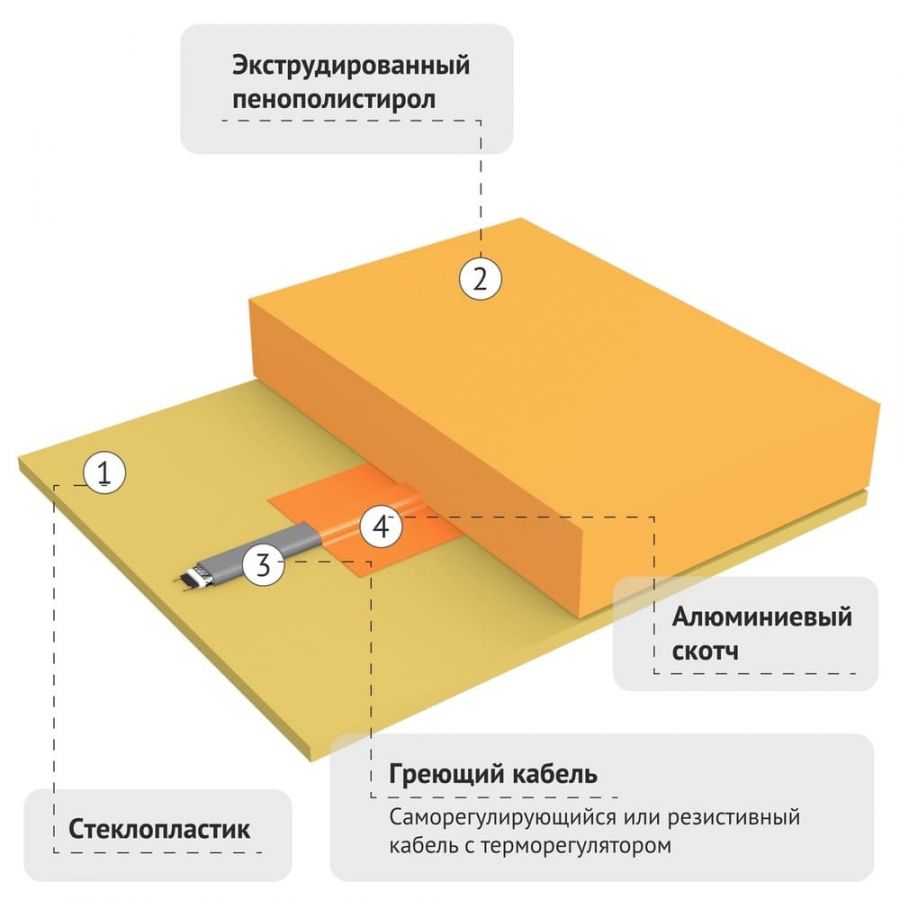 - Греющий кабель с терморегулятором;