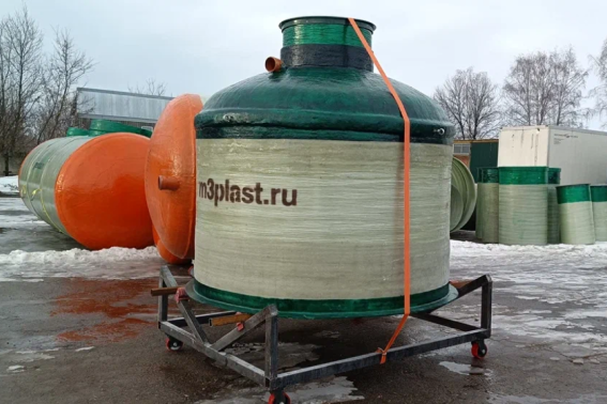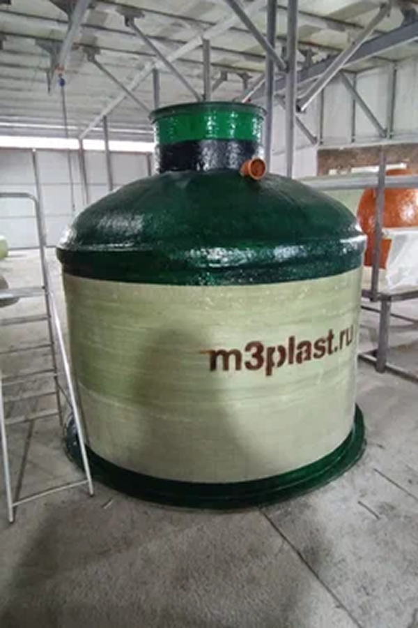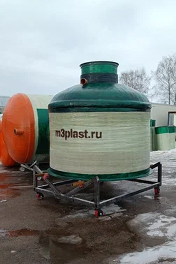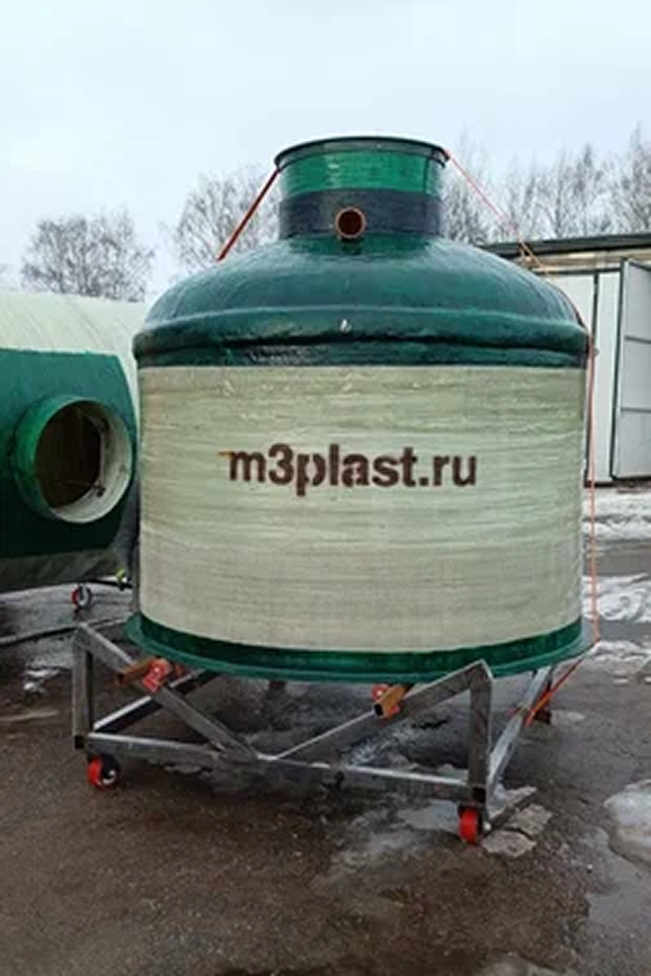 Конструкция М3Пласт Жироуловитель состоит из цилиндрического резервуара, разделённого перегородками на отсеки, подводящего и отводящего патрубков, колодцев обслуживания с крышками.